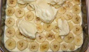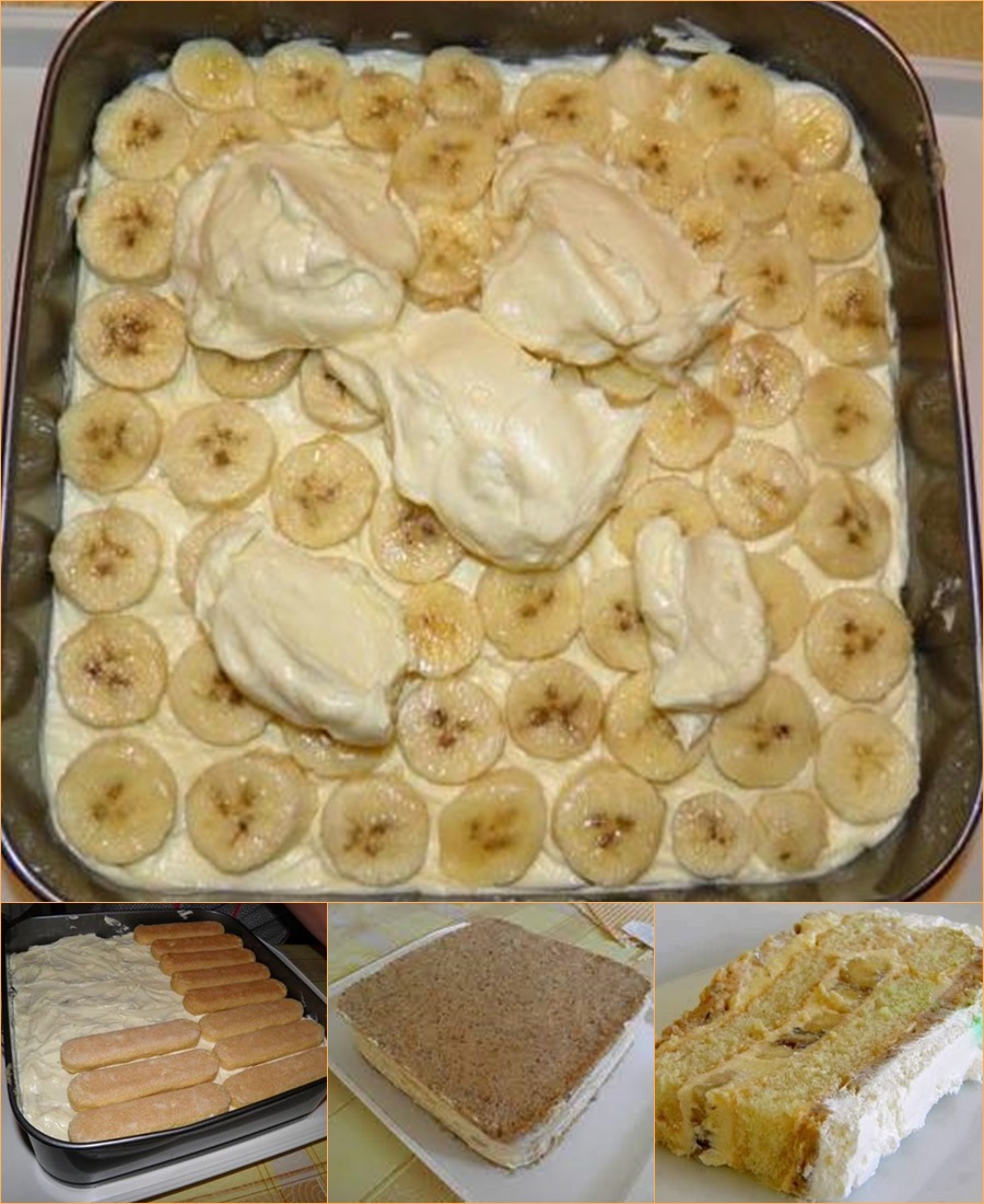 Kada ste sve pripremili krećemo sa slaganjem kolača. Na pripremljenu podlogu od keksa nanosi se prvi sloj kreme – otprilike četvrtina ukupne količine. Preko toga se slaže sloj piškota koje su prethodno kratko umočene u mlijeko, kako bi omekšale i upile dio vlage. Slijedi još jedan sloj kreme, pa red banana narezanih na kolutiće, zatim opet krema, još jedan sloj piškota i preostali dio kreme. Važno je da se slojevi ravnomjerno raspoređuju kako bi torta imala stabilnu strukturu. Na sam vrh se postavlja gornji dio od keksa koji je ranije oblikovan preko folije.