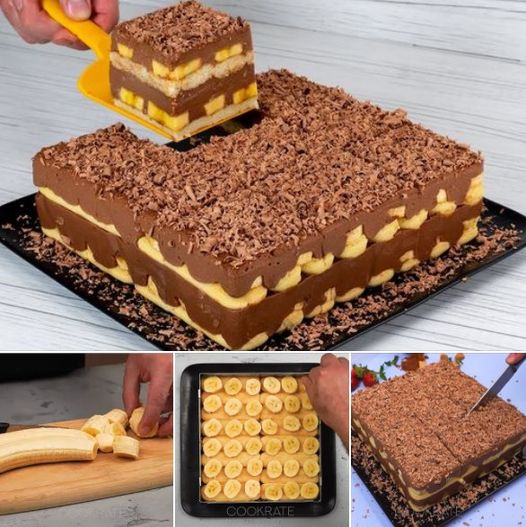 Poređajte opet keks, pa banane i preostali fil. Poravnajte. Stavite u hladnjak na sat vremena. Preko izrendajte čokoladu.