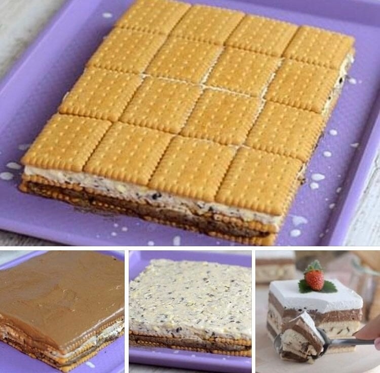 Na tacnu poredajte keks petit koji je potrebno prethodno umociti u mlijeko. Mozete kolac slagati u tepsiju po zelji.