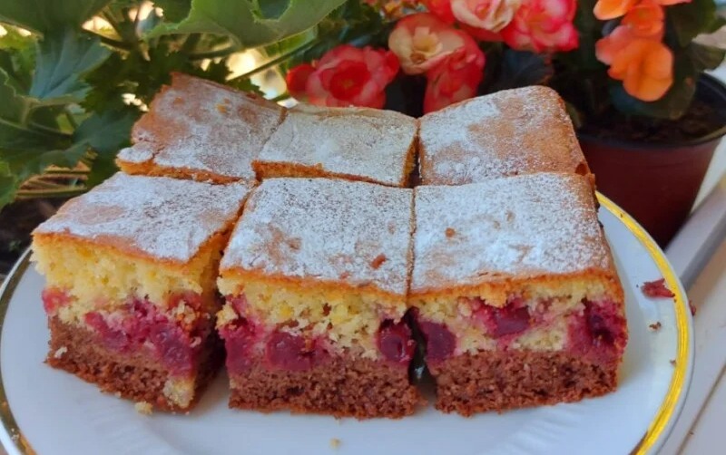 Izvadite iz rerne pa preko tamnog dijela stavite visnje pa sipajte svijetli dio i rasporedite.