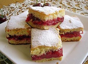 Kada se kolač ispeče, ostavi se da se potpuno ohladi. Tek tada se seče na kocke ili štanglice – po želji – i pospe šećerom u prahu radi dodatne arome i vizuelnog dojma. Servira se hladan ili na sobnoj temperaturi, a posebno lepo ide uz osvežavajući napitak poput limunade ili čaja.