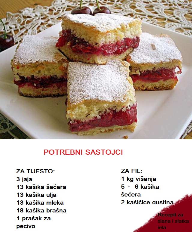 Nakon toga, pleh se izvadi iz rerne i ravnomerno se rasporedi prethodno pripremljeni fil od višanja. Preko fila se potom izlije preostala količina testa, vodeći računa da se masa rasporedi što ujednačenije, kako bi se višnja ravnomerno obložila sa svih strana. Sada sledi završno pečenje. Temperatura se smanjuje na 180 stepeni, a kolač se vraća u rernu i peče dodatnih 35 do 40 minuta. Kolač treba da porumeni s gornje strane i da blago naraste, a miris vanile i pečenog testa počeće da se širi kuhinjom – znak da se približava kraj pripreme.