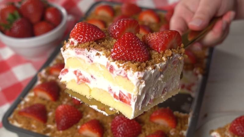 U kalup poredajte piskote i preko stavite fil. Dobro ohladite u hladnjaku pa pospite keksom i ukrasite jagodama.