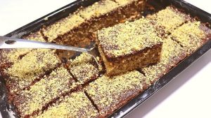 Nakon što ste pripremili smesu, uzmite pleh i obložite ga pek papirom. Ravnomerno rasporedite smesu u pleh i lagano je poravnajte špatulom ili kašikom.