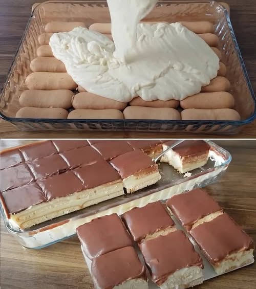 Prvi sloj natopljenih piškota se redom slaže u pravougaoni pleh ili kalup, tako da potpuno pokrije dno.