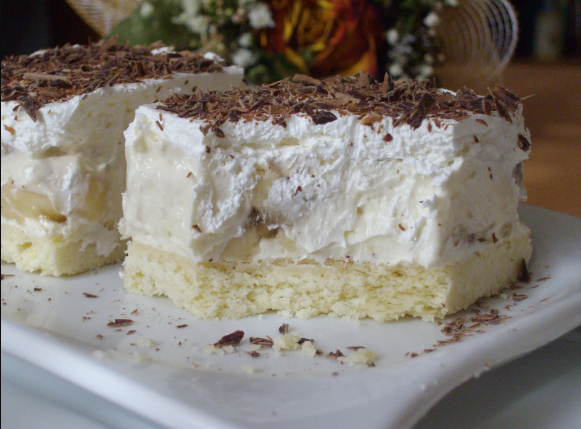U ohlađeno dodajte pola tučenog šlaga u koji ste dodali učvrščivač za šlag i narezane banane, koje ste nakapali limunovim sokom da ne potamne.