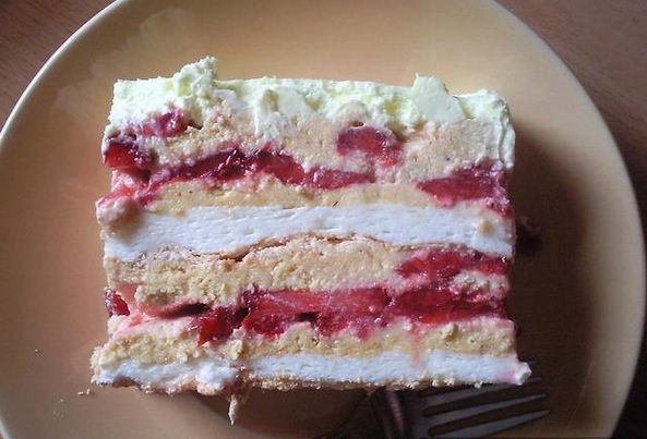 Na koru stavite pola fila, onda isjecene svjeze jagode,drugu polovinu fila i odozgo umucen slag.
