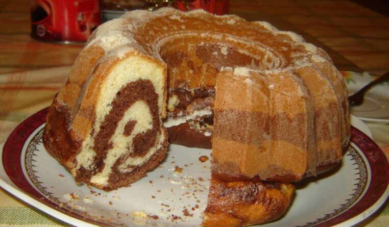 Kalup za kuglof premazati uljem i pobrašniti pa izliti pola bijele smjese, pola smeđe,