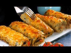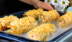 Kada je osnova od krompira pečena, izvadite je iz rerne i ostavite da se prohladi nekoliko minuta. Zatim je isecite na šest jednakih pravougaonika. Na svaki deo rasporedite pripremljeni nadev, a zatim pažljivo urolajte, formirajući čvrste rolnice.