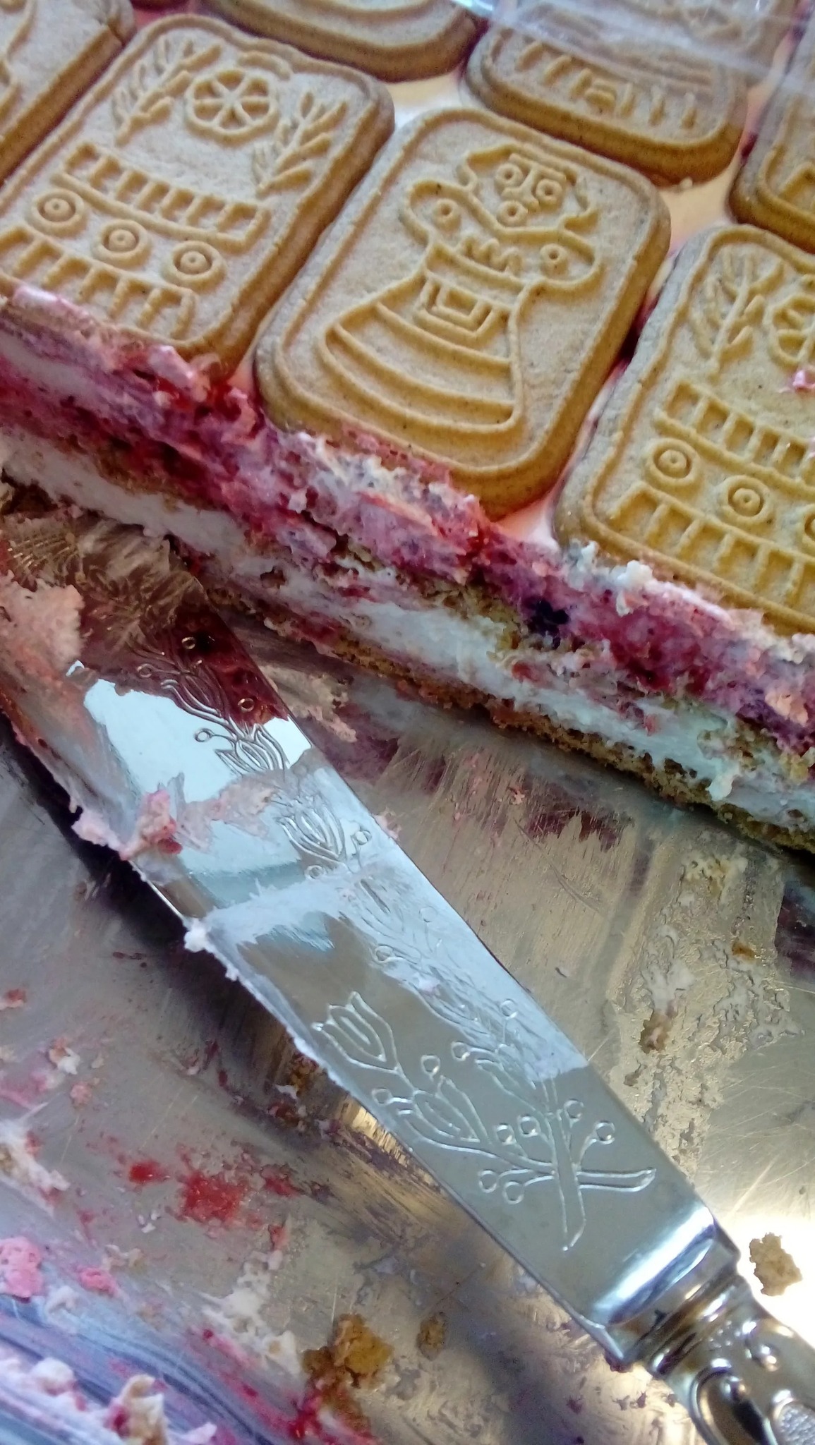 Sloj speculaas keksa, pola kreme, opet sloj speculaas keksa, smrznuto šumsko voće, drugu polovicu kreme, sloj speculaas keksa