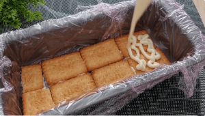 Kalup pravougaonog oblika (može i okrugli ako preferirate) obložite providnom folijom. Ovo će vam olakšati vađenje torte nakon hlađenja i pomoći da zadrži pravilan oblik.