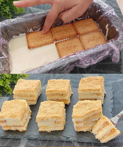 Preko fila poređajte sloj keksa. Keks možete prethodno blago pokvasiti u mleku ako želite mekšu strukturu, ali to nije neophodno – zavisi od vaših želja.