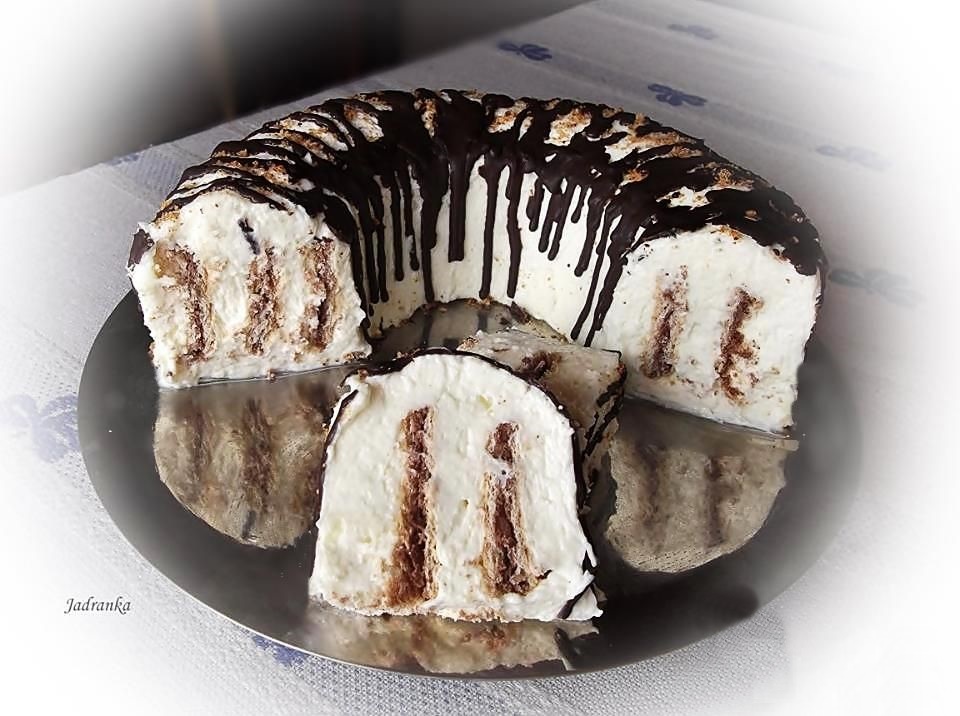 Ohladjen kolac prevrnite na tanjir i ukrasite istopljenom cokoladom.