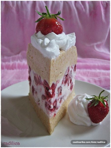 zelatinu natopite po uputsvu sa vrecice. Mlijeko i secer sjedinite u serpi i ostavite na vatri dok ne prokljuca. U prokljucalo mlijeko dodajte rastopljenu zelatinu i mijesajte dok se ne sjedini. kremu ostavite da se dobro ohladi. najmanje 6 sati. Kada se krema dobro ohladila u nju dodajte slag. Miksajte mikserom dok se sve lijepo ne sjedini. Odvojite 1/3 kreme te u nju dodajte jagode. u ostatak kremem dodajte mljevenu plazmu. Dublju zdjelu oblozite aluminijskom folijom i sipajte pola kreme sa keksom. zatim preko kreme sa keksom spijate kremu sa jagodama i na kraku dodate ostatak kreme od keksa. kolac ostavite da se dobro ohladi u frizideru. uzivajte i prijatno!