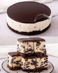 Kada je smesa kompaktna i bez grudvica, pažljivo umešati naseckane Oreo kekse – koristi se 1 pakovanje od oko 405 grama, isekčeno na četvrtine, kako bi se u svakom zalogaju osetila hrskavost keksa.