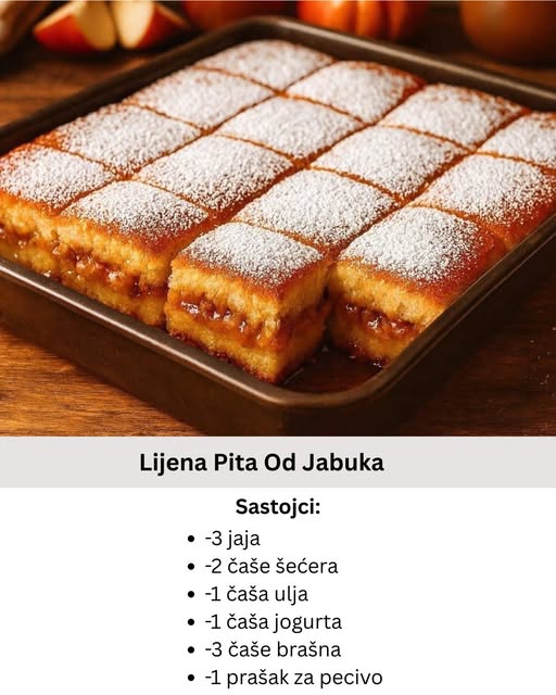 Kada se donji sloj tijesta ispeče, izvadite ga iz rernee i ravnomjerno rasporedite nadjev od jabuka. Jako bitno je da jabuke budu raspoređene do samih ivica kako bi svaka kocka kolača imala jednak ukus. Nakon što ste to učinili, preko jabuka pažljivo prelijte drugi dio tijesta. Najlakše je to uraditi pomoću kašike – stavljajte manje količine tijesta po površini i potom ga nježno razmažite. Ako se tijesto malo miješa s jabukama, ne brinite – to kolaču daje rustičan izgled i dodatnu sočnost.