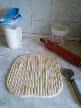 Sada tijesto podijelite na dva mejednaka dijela. Manji dio razvaljajte u cetvrtasto.,premazite sa rastopljenim margom i rezite na trakice ali ne do kraja.
