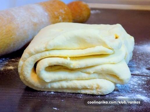 Ispreklapajte ga na trecinu a onda okrenite tijesto za 1/4 kruznice i tako jedno 6-7 puta,svaki put razvaljajte oklagijom izmedju.