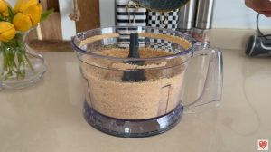 Prvo u blenderu usitniti kekse dok se ne pretvore u sitnu mrvicu.Onda u smjesu dodati otopljeni puter i sjediniti dok da postane kompaktna smjesa.Smjesu koju dobijete ravnomjerno rasporediti po dnu kalupa, najbolje s odvojivim obručem.Najbolje je da koristite dno čaše kako biste utisnuli smjesu čvrsto u kalup.