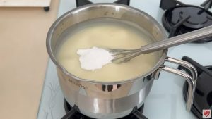 U tu smjesu polako dodavati mlijeko i šećer uz stalno mijesanje da se ne bi pojavile grudvice.