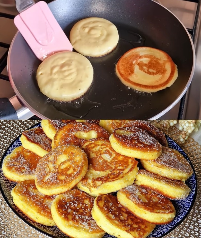 Na srednje jakoj vatri zagrejte tavu sa malom količinom ulja. Nije potrebno ulje između svakog pečenja ako tiganj ima neprianjajuću površinu, ali ako koristite običan, možete ga povremeno dodavati.Žlicom uzimajte male količine tijesta i spuštajte ih na zagrijanu tavu, formirajući krugove veličine 5–6 centimetara. Ukoliko želite preciznije oblike, možete koristiti slastičarsku vrećicu sa širokim otvorom. Palačinke pecite sa svake strane otprilike minut do dva, dok ne porumene. Kada se na površini pojave sitni mehurići, to je znak da je vreme da ih okrenete.