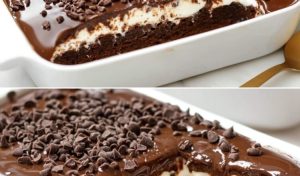 Gotov šlag se ravnomjerno rasporedi preko brownie sloja, pazeći da površina bude glatka. Kolač se zatim stavlja u hladnjak na otprilike pola sata kako bi se ovaj sloj stabilizovao.