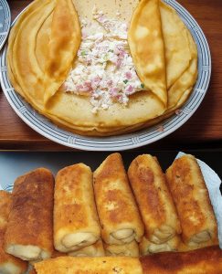 Možete koristiti svoj standardni način pravljenja palačinki a ako ne želite evo mog recepta. U zdjeli izmiksam jaja sa malo soli i šečera a zatim dodam mlijeko i kisleu vodu pa sve dobro izmiješam. Potom dodam i brašno to po procjeni dodajem da dobijemklasično tijesto za palačinke. Palačinke zatim pčem na blago podmazanoj tavi, sa obe strane, dok ne dobiju blagu zlatnu boju. Kada su sve ispečene, ostave se da se ohlade kako bi bile pogodnije za punjenje i motanje.