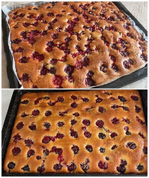 Nakon što se kolač kratko zapekao, iz rerne se pažljivo vadi i na njegovu površinu se ravnomerno raspoređuju višnje. Važno je da višnje nisu previše vlažne – ako koristite kompot, dobro ih ocedite. Takođe se preporučuje da se ne preklapaju kako bi svaka imala svoje mesto na površini i ostala vidljiva nakon pečenja.