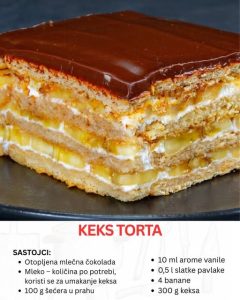 Prvo pripremite sve sastojke pa onda pocnite sa slaganjem kolaca. Kao podlogu koristite tepsiju ili kalup, po mogućstvu sa ravnim dnom, kako bi slojevi bili ujednačeni. Umocite keks kratko u mlijeko tek toliko da omekša, ali da ne postane previše natopljen. Takav keks se slaže jedan do drugog, formirajući čvrstu i stabilnu koru koja će nositi ostatak torte.