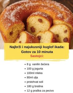 Kolac pecite u prethodno zagrijanoj rerni na umjerenoj temperaturi dok ne dobije zlatno smedju boju. Tokom pečenja, kuhinju ispunjava prijatan miris vanile i pečenog testa. Provera da li je kolač gotov može se obaviti pomoću čačkalice – ako izađe suva, kolač je spreman.