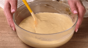 Smjesu pažljivo izmiksajte kako bi se dobila glatka masa bez grudvica. Važno je ne pretjerivati s miješanjem, jer previše rada može uticati na teksturu i učiniti tijesto tvrđim nego što bi trebalo biti. Kada je smjesa spremna, ravnomjerno se izlijeva u prethodno pripremljen kalup.
