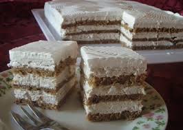 5. Na kraju se ceo kolač oblaže slojem umućene slatke pavlake (otprilike 2 dl), čime se dobija elegantan i ukusan završni sloj.