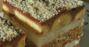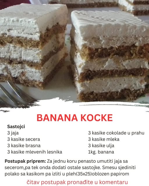 Kada se kolač dobro rashladi i stegne, seče se na pravilne kocke, što i jeste razlog zbog kog se zove Banana kocke.