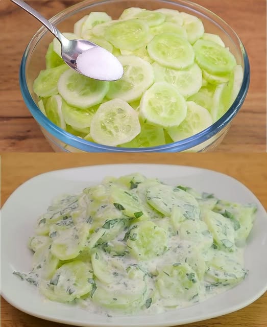 Prvo pripremate krastavce pa nakon što se oguli, krastavac se seče na tanke kolutove ili polumesece, po želji.Kriskice krastavaca prebacite u neku veću posudu, gde se obilno posipaju solju i dobro promiješaju. Ovaj korak je ključan jer so pomaže da krastavac otpusti višak vode, što će kasnije sprečiti da salata bude previše vodena. Krastavci se ostavljaju da odstoje desetak minuta kako bi se ovaj proces odvijao temeljno.