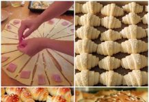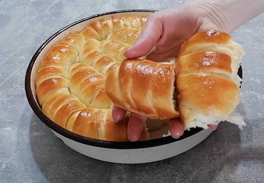 kada je tijesto nadošlo premijesite ga i podijelite na 8 jednakih djelova. Od tijesta napravite loptice. Oblikovane loptice razvucite u oblik pravougaonika, premažite sa puterom te napravite proreze na vrhu a zatim urolajte. Ponovite postuapk sa ostalim lopticama.