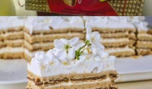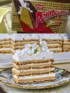 U međuvremenu umutite maslac Važno je da bude sobne temperature kako bi se lakše sjedinio sa filom. Kada se puding prohladi, umutite ga dodatno mikserom da postane svilenkast, a zatim postepeno dodajte umućeni maslac i sjedinite u homogenu smesu. U drugoj posudi pripremite šlag – 300 g šlaga umutite sa 400 ml hladnog mleka. Mešajte dok ne dobijete čvrstu, ali penastu teksturu koja će se lako nanositi. Nakon što su fil i šlag spremni, sledi najzabavniji deo – slaganje torte. Ovaj proces zahteva pažnju, ali nije komplikovan. Postupite ovako – Na poslužavnik ili tacnu postavite prvi sloj keksa. Premažite ga slojem puding fila. Preko fila nanesite sloj šlaga. Ponovite sve – opet red keksa, pa fil, pa šlag.