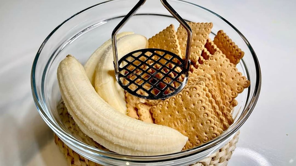 Prvo u vangli pomijesajte izgnijecene banane i kekes. Onda smjesu mijesite rukama da s eizjednaci.