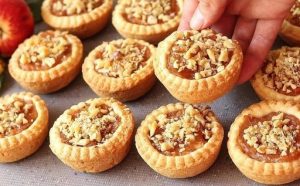 Kada je tijesto odmorilo, razvaljate ga na debljinu od 4 do 5 mm. Pomoću okruglog rezača promjera oko 8 cm izrežu se krugovi koji će služiti kao podloga za košarice. Kalupi za muffine lagano se premažu uljem, a zatim se u njih pažljivo utisnu izrezani krugovi tijesta kako bi se oblikovale male košare. Za svaku dobijenu košaricu stavite nadjev od jabuka. Na kraju se sve pospe sjeckanim orasima, koji daju dodatnu hrskavost i bogatiju aromu.