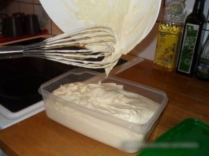 Prvo u nekoj dubljoj posudi umutite slatko vrhnje dok ne postane čvrsto i kremasto. Ovo je jako bitno kako bi se postigla odgovarajuća tekstura finalnog sladoleda.