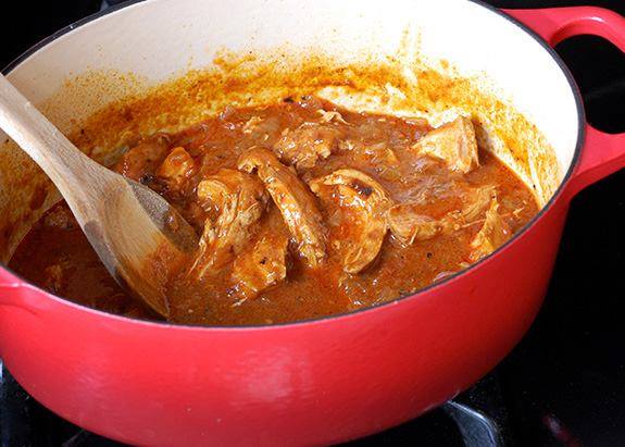 Dodajte piletinu isjecenu na kockice. Kada je piletina malo zapecenja posolite i zabiberite.