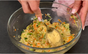 Dok tikivce odmaraju vi mrkvu i krompir naribajte pa posuu+ite kuhinjski ubrusu kako bi ubrus pokupio višak tečenosti. Tikivce ocijedite te u zdjeli pomiješajte tikivce, mrkvu i krompir. Dodajte naribani sir sjeckani peršin i mladi luk. Umiješajte brašno, sušeni češnjak, papriku, sol i papar. Dobro promiješajte smjesu kako bi se sastojci ravnomjerno povezali. Smjesu je potrebno ostavit 10 minuta da odstoji.