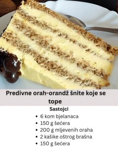 Dok se krema hladi, prelazi se na pripremu kora. U čistoj, suvoj posudi mikserom se mute bjelanca dok ne zapjene, a zatim se postepeno dodaje šećer. Miksanje se nastavlja sve dok ne dobijete čvrst, sjajan snijeg koji se ne pomjera sa mutilica. Nakon toga se dodaju mljeveni orasi i dvije kašike oštrog brašna. Ovi sastojci se ne miksaju, već se lagano umiješaju drvenom kašikom ili silikonskom lopaticom, kako bi masa ostala prozračna.