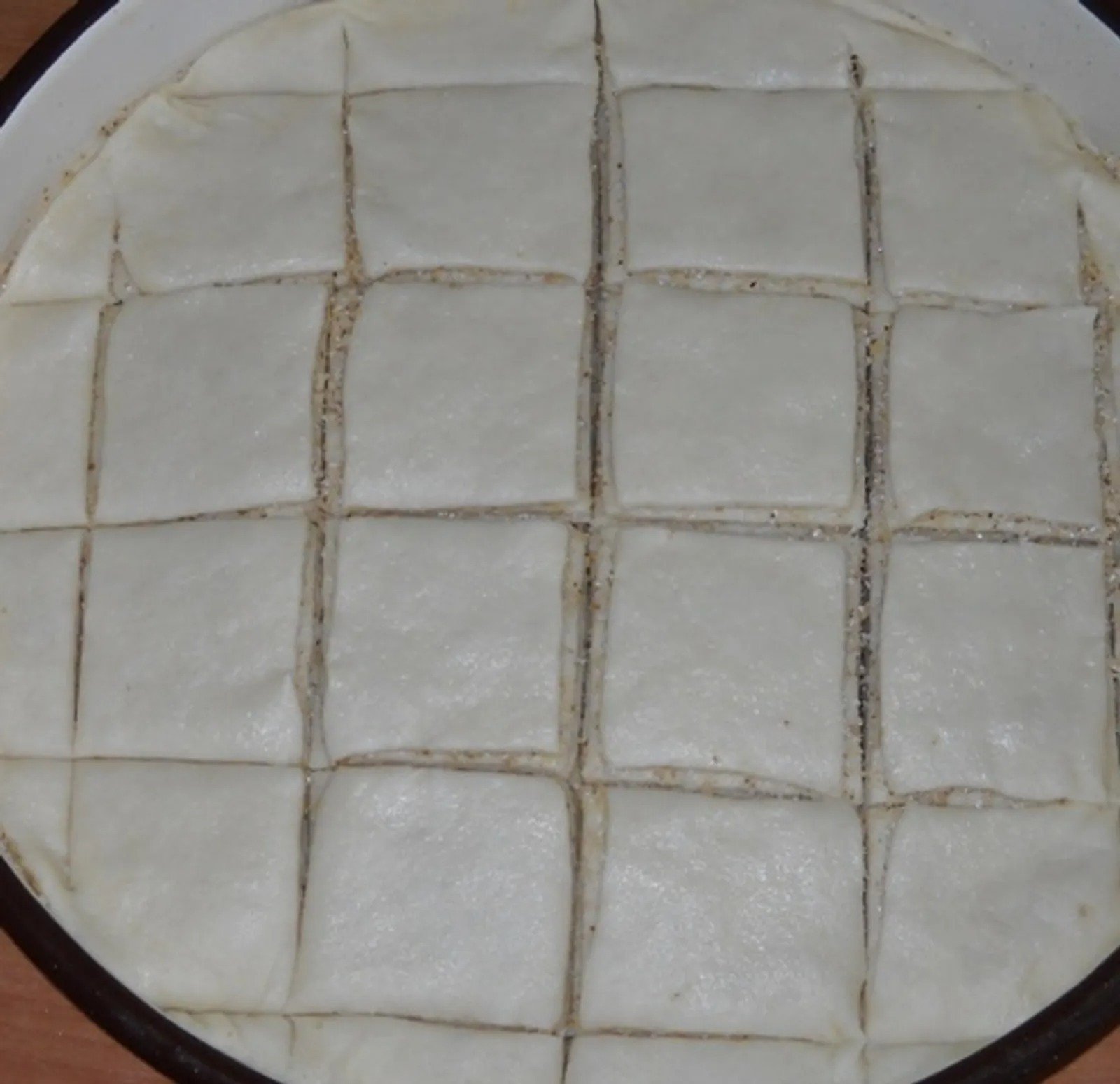 Poklopite drugom, tanko razvaljanom korom. Opet pospite smjesom od oraha i šećera. Postupak ponavljajte, dok se sastojci ne utroše. Posljednju koru ne posipajte filom. Izrežite na kocke, pa ostavite da miruje 20-tak minuta.