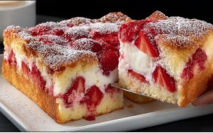 Preko svega se izlije preostalo tijesto, vodeći računa da se ravnomjerno rasporedi i prekrije što više voća. Neke jagode mogu ostati vidljive – to daje vizuelni šarm gotovom kolaču.