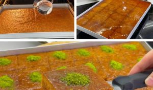 Vrlo bitno je da serbe ne sipate direktno po vrucem kolac nego oboje trebaju biti mlaki. Ovaj detalj je ključan za ravnomjerno upijanje i idealnu teksturu. Ali prije nego što šerbet dođe na red, kolač se preliva sa jednom čašom hladne vode. To je trik koji dodatno omekšava biskvit i priprema ga za prijem šerbeta.