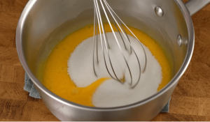 Dok se mlijeko postepeno zagrijava, uzima se velika zdjela i u njoj pomijesajte žumanca i šećer u prahu. Cilj je dobiti svijetlu, zračnu smjesu koja djeluje gusto i kremasto – ovaj proces traje 2 do 3 minute i može se raditi električnim mikserom ili energičnim ručnim miješanjem.