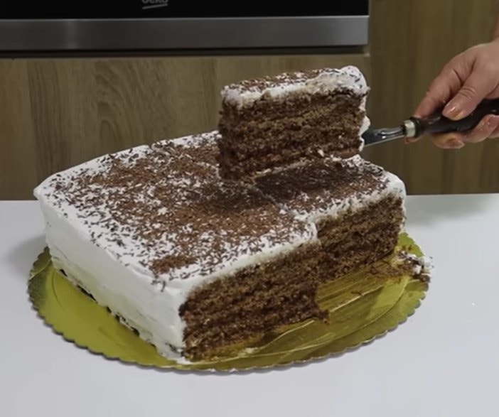 Prvo od navedenih sastojaka za biskvit umutite tijesto pa ispecite dva biskvita koja cete presjeci na pola. Dobit cete cetiri kore.
