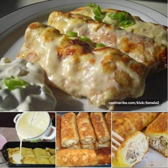 Kada ste napunili posuduprelijte sa bijelim sosom te naribajte sir i pecite na 200 stepeni dok ne porumene.