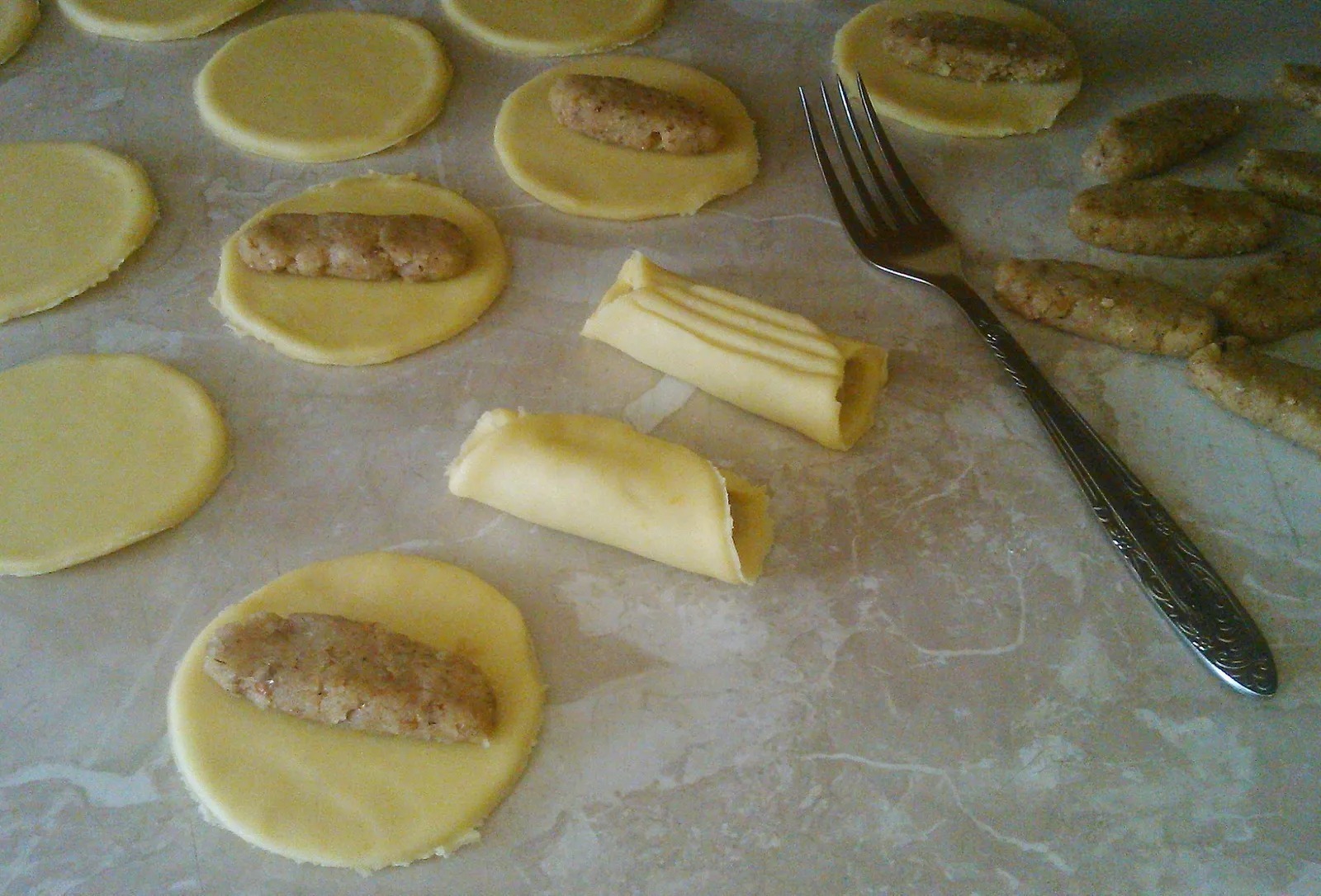 Ivice koje ce se preklapati istanjite prstima. Premazite secernom otopinom, prebacite jednu stranu tijesta preko fila,preko nje i suprotnu malo pritisnite da se jos malo istanji i prevucite vilicom tako da ostane tag.
