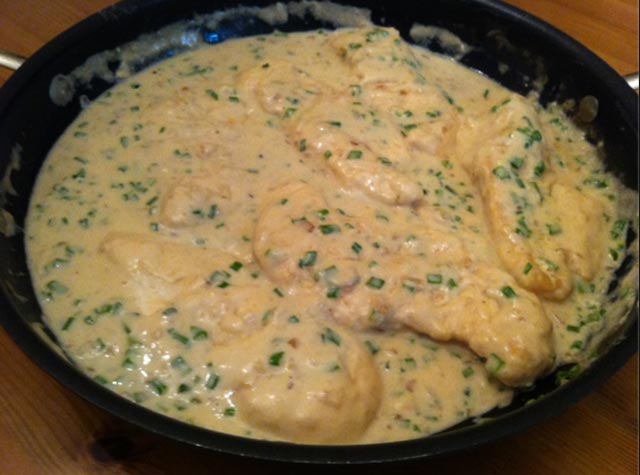 Prvo piletinu izrezite na snicle pa posolite,pobiberite i istucajte. Poprzite na tavi s uljem dok ne porumeni pa sklonite na tanjir. U isto vrijeme uspite vrhnje za kuhanje i dodajte namrvljeni sir.